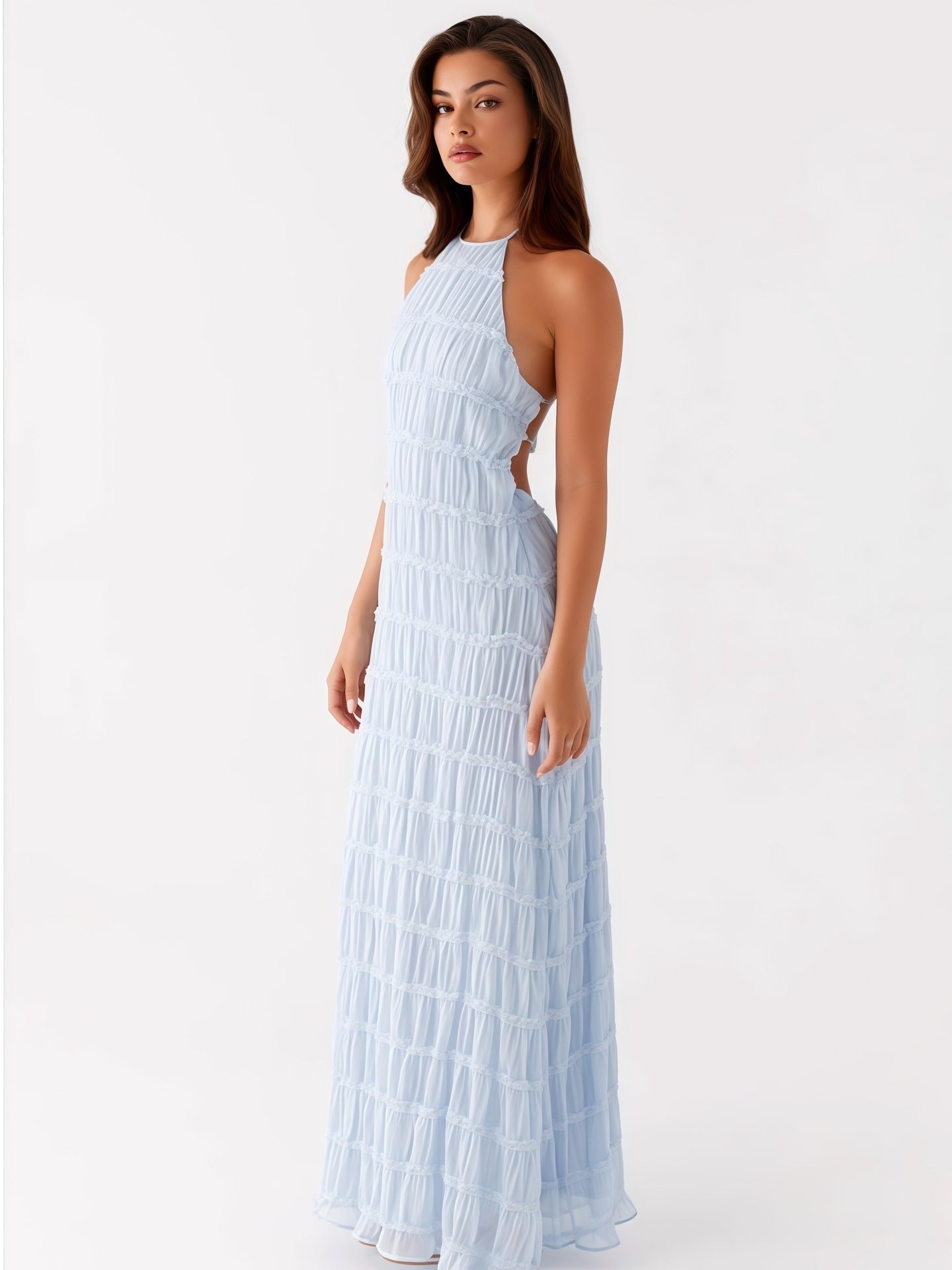 - Design : Décolleté américain (Halter), dos-nu, taille élastiquée, texture plissée intégrale.