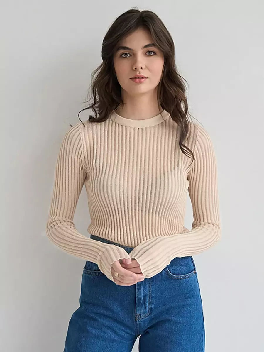 - Matière : Maille fine côtelée, légèrement transparente